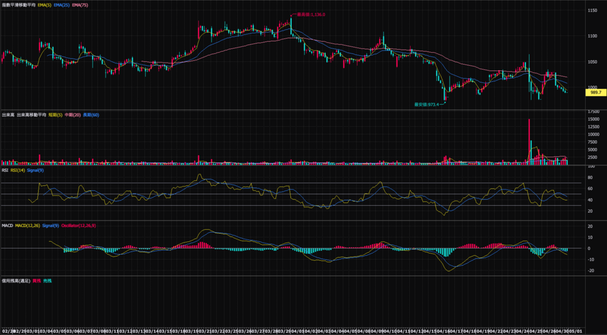 取引開始後から1010円近くまで下落し、以降は🇺🇸消費者信頼感指数への懸念から下落相場へ。最終価格は989.7円。
